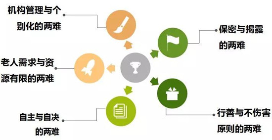 老年長期照護機構(gòu)的服務(wù)概念因為機構(gòu)本身具有控制的特性,一定會面臨照護上的倫理議題。所謂機構(gòu)本身的特性指的是為了執(zhí)行照護與提供給老人具有一定生活質(zhì)量的服務(wù),使照護本身面臨了偏好的沖突、老人的問題行為、有限的資源、老人無法選擇與誰住在一起所產(chǎn)生的問題等,衍生出在日;顒又欣先俗饑馈⒆詻Q、人身安全與健康等復(fù)雜的討論。